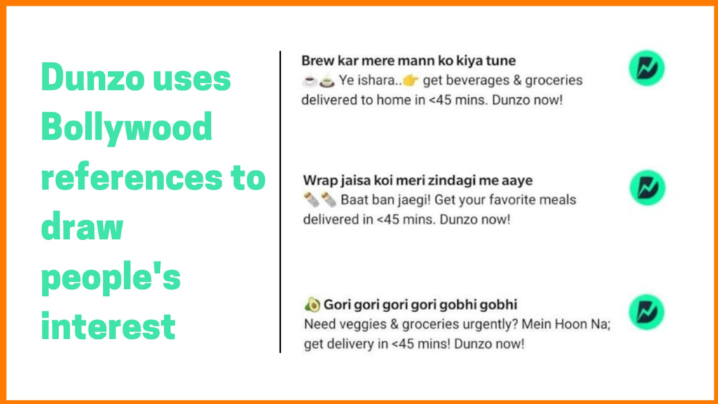 Dunzo uses its social media content in a way relatable to locals. The communication is often in Hinglish or any local language mixed with English. This gives Dunzo a clear advantage of being more relatable and relevant to the local audience in a particular geography.