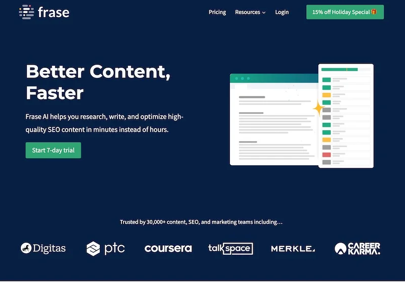 Frase is a writing AI tool that aids in content research and creation. By utilizing machine learning, Frase analyzes your topic and provides relevant information and statistics from reliable sources. It also generates outlines and summaries, saving you time and effort. Additionally, Frase offers SEO optimization suggestions, helping you create content that ranks higher in search engine results. With its advanced content briefs, you can ensure your articles cover all the necessary points. Frase is an invaluable tool for streamlining your research process and creating well-informed, SEO-friendly content.