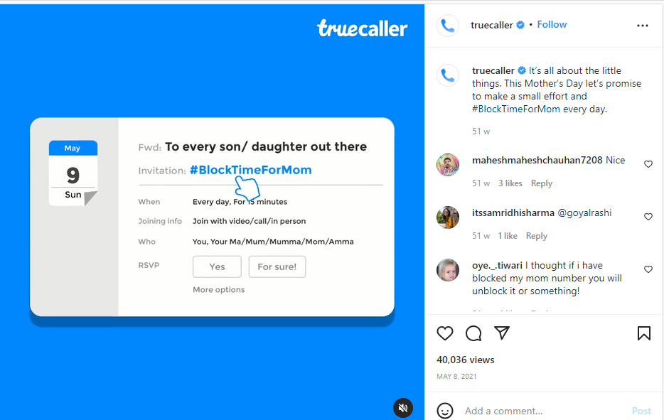Truecaller cleverly leveraged its USP, i.e., helping people block unwanted callers. Only, this time around, it was blocking time for mothers. The campaign generated over 40K views and was greatly appreciated by viewers for its reminder to take some out for the people who matter. It is clearly one of the best Mother’s Day social media campaigns if you ask us.