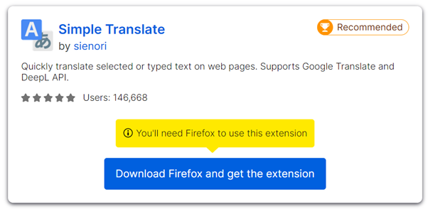 ● Search for a Firefox language extension. It will look something like the image below, where Simple Translate is a trusted extension recommended by Firefox.