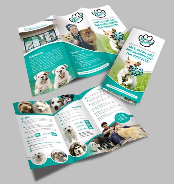 Appealing brochure designs do not necessarily have to be overpowering. Look at this simple design of a brochure from a pet creche. It is full of relevant images, along with the creche logo, and just about the right amount of information to go with it.