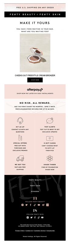 If you’re creating a product introduction or marketing email, it’s a common practice to begin with an image of the item. But what if you present that object in an unusual manner? This fantastic email from Fenty Beauty, with its eye-catching email header design, compelled us to scroll down.