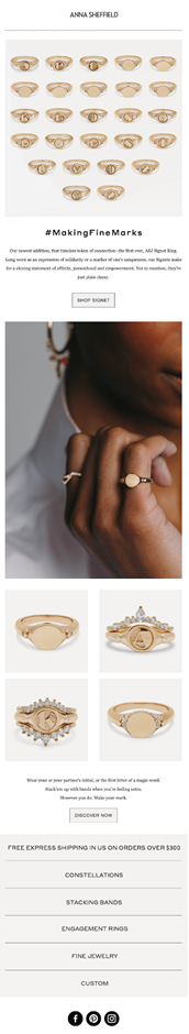 According to Anna Sheffield, GIFs in an email may go a long way. They can demonstrate how a product works, cycle through numerous things from frame to frame, or delight! They are ideal for practically any occasion or email type. Check out Anna Sheffield Jewelry’s newsletter banner design and scroll down for the GIF.