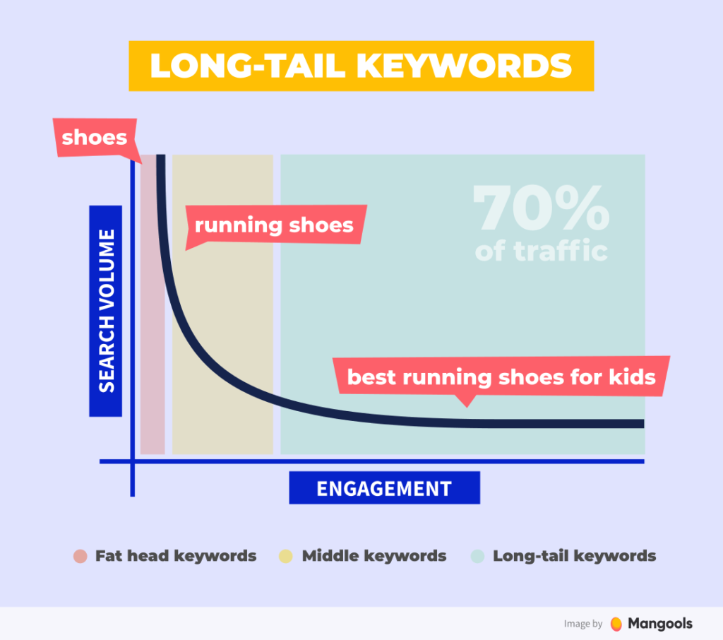These are keywords that are longer phrases and contain three or more words. Long-tail keywords are specific and show users’ intent. Long-tail keywords drive more relevant traffic to your business page.