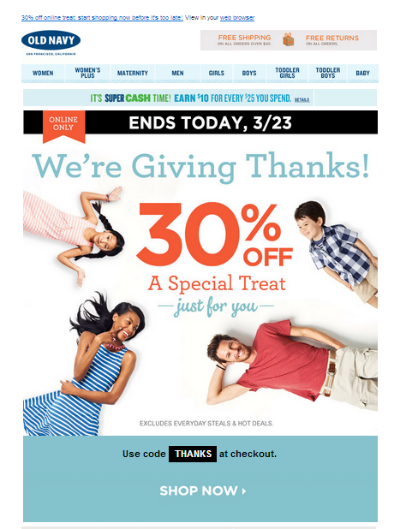 These emails intrigue the receiver and pique the urgency to buy the product. These email marketing templates come with flashy colors and a timer, which help to create FOMO (Fear of Missing Out). See how the Old Navy did.