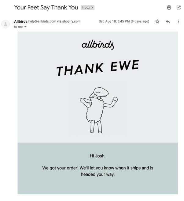 Just a gesture of gratitude. Thank you email template usually comes with a feedback section also. Have a look at how All Birds are doing.