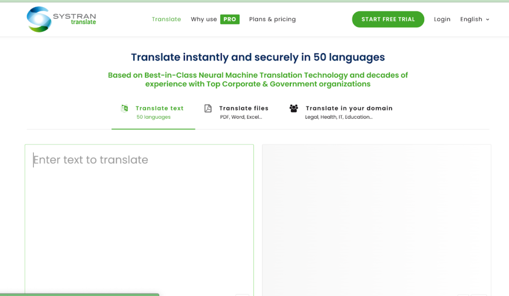 Systran Translate was the first commercial language-translation tool used and is still preferred by users as it offers content translation in more than 140 languages. It has innovative features such as pure neural machine translation (PNMT), open-source technology, and a hybrid translation model, to name a few.