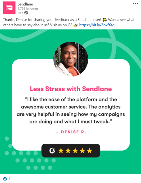 You can easily share your testimonials through Instagram posts, stories, reels, or Facebook posts. This is a great way to level up your B2B social media marketing strategy. Here’s how Sendlane did it: