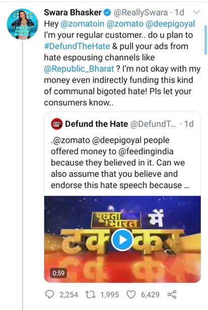 Swara particularly pointed out certain hate speeches on the channel and created the hashtag #DefundtheHateZomato and made a public campaign to pull down all its ads from that channel. This indeed snowballed into a sizable Zomato ad controversy to date, although the contents of the Zomato ad were not debated about here.