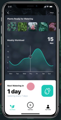 A live tracker gives the user an authentic experience of watering plants. There are two screens with interactions.