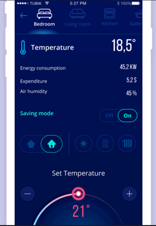 The user can choose any option from temperature, humidity, and energy consumption. The animation is agile, interactive, and colorful. The dark background is good for the eyes.