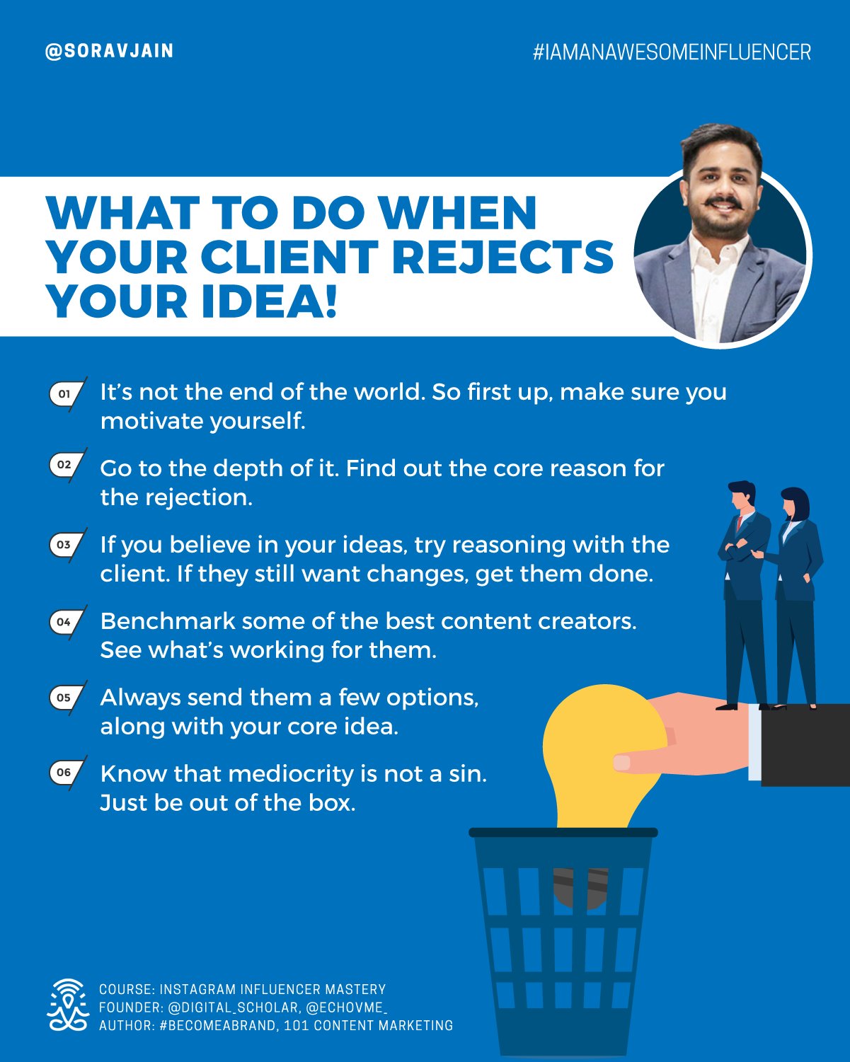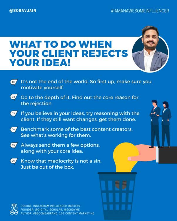Client needs may frequently change based on company requirements as per budget or skills or the existing client-freelancer relationship. Rejection may be frequent, but the trick to surviving is not to take any such situation to heart.