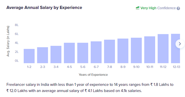 ● The average salary continues to increase with experience. Freelancers with 12-15 years of experience earn an average INR 6.6-6.7 LPA salary.
