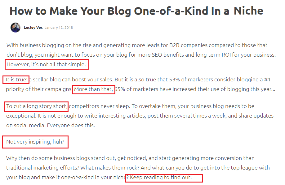 Bucket brigades are used to have a flow in your writing. A piece of information using bucket brigades is designed to keep your gaze on the page as you progress from one line to the next. These bucket brigade phrases increase readers’ curiosity in your blog post and