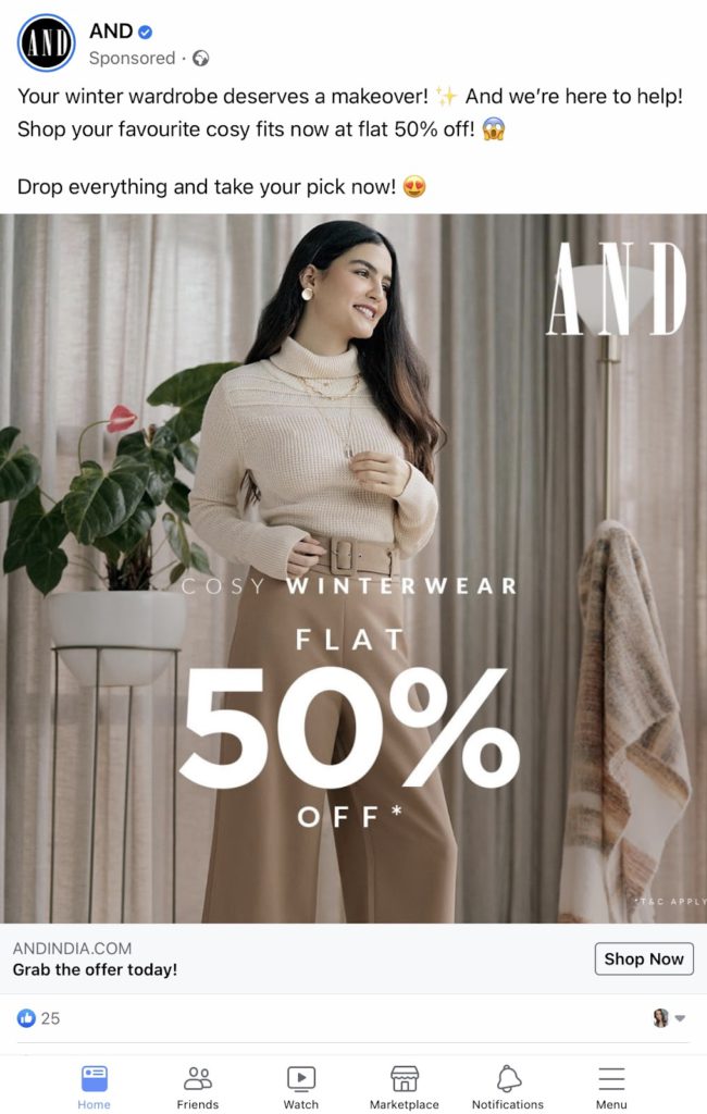 Include a clear and to-the-point call-to-action (CTA) button to grab your audience’s attention. For example, “Shop Now” CTA is an excellent value-added prop to encourage the audience to visit the brand’s website or the landing page and increase traffic and engagement.