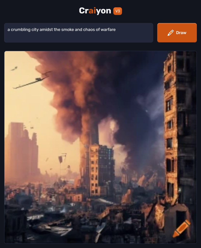 Generated By Craiyon (A Crumbling City Amidst The Smoke And Chaos Of Warfare)