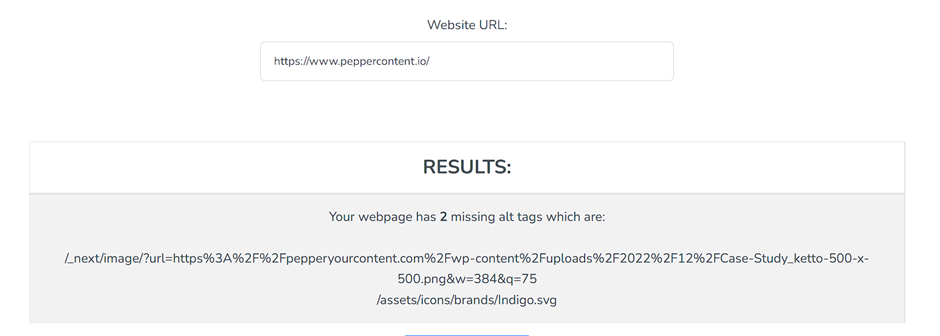 - Once you do, the tool will present a result box with links to the images where the alt tags are missing.