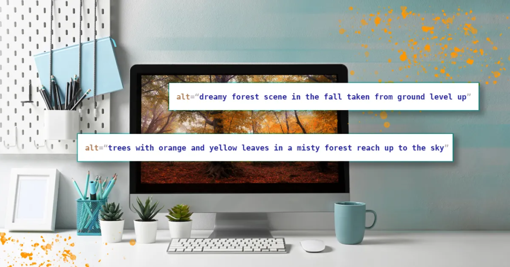Good tag: <img src=”leaves.jpg” alt=”green, yellow, orange autumn leaves”>
