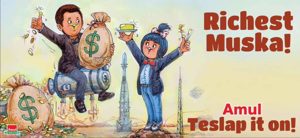 Last year, Elon Musk became the richest man in the world with a net worth of $185 billion. Amul celebrated this feat achieved by the world-famous entrepreneur with a quirky ad. It shows Musk on a rocket with a bag full of money. The tagline reads ‘Richest Muska’.