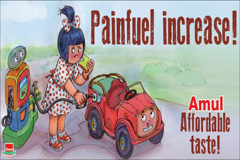 Continuously increasing fuel prices is India’s aching nerve. Amul knows just how to soothe it with its funny ads. The company rolled out an ad showing Amul girl sulking over the fuel price. The tagline read ‘Painfuel increase, affordable taste,’ subtly advertising Amul products.