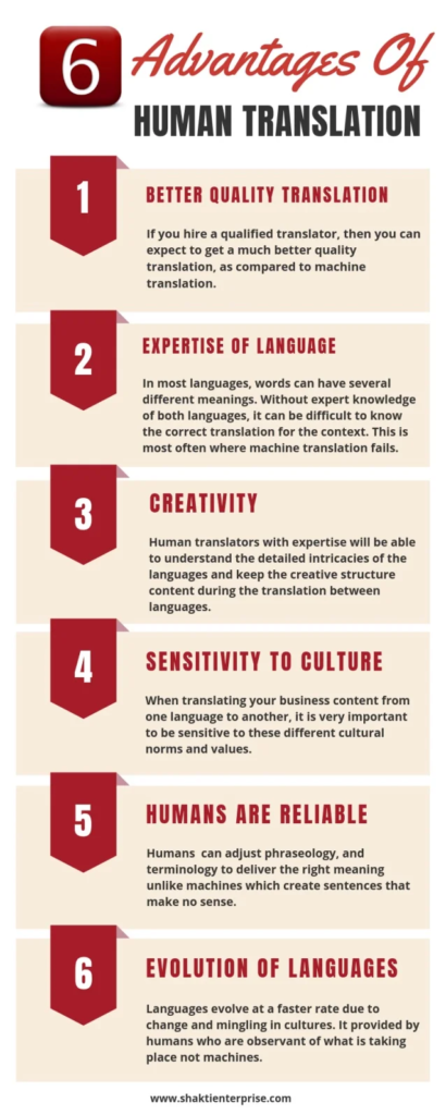 They are capable of recreating the nuances of the languages in the target languages if required. Machine-translated content is also prone to errors of negation. It may not be able to understand and differentiate between language peculiarities.