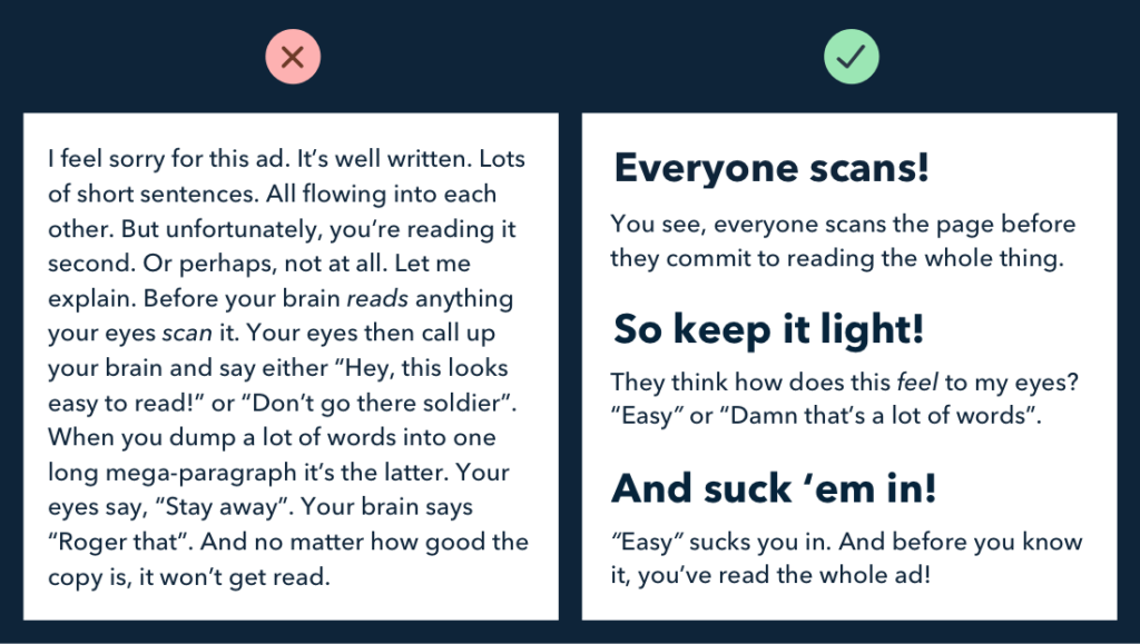 According to Nielson, despite changes in design, the basic scanning behavior of most readers remains unchanged. Not all people surfing the internet read every single sentence they come across. The truth is, people rarely read online unless they stumble upon engaging content. When writing B2B copy, you should focus on brevity, without missing out on the essence.