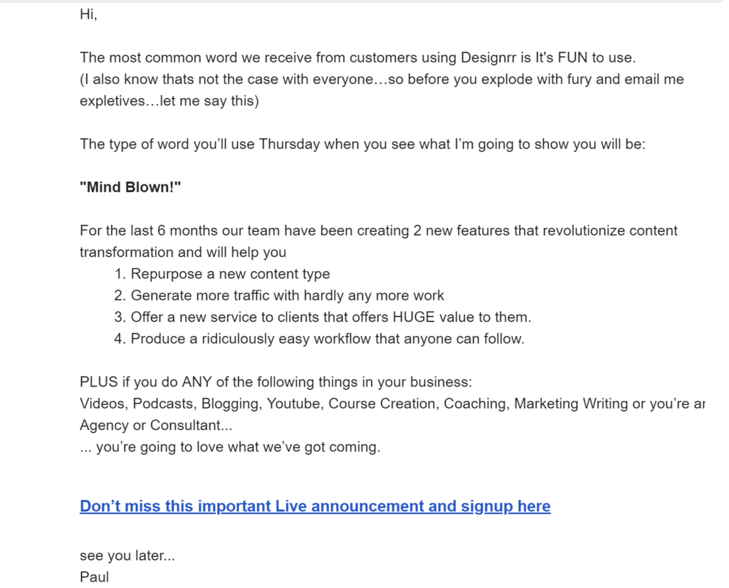 For B2B e-newsletters, the average length of the best performers was less than 241 words. Check out this e-newsletter from Designer, which is just about 150 words long.