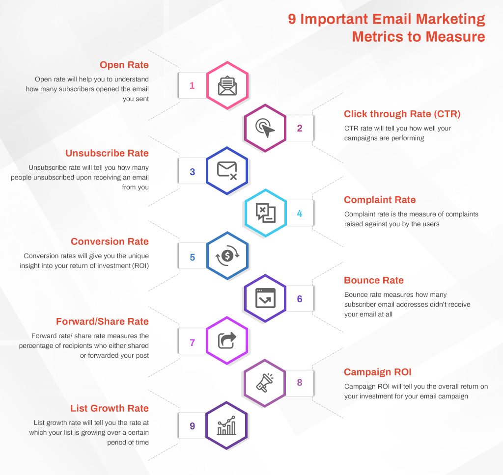 E-mail marketing is one of the oldest techniques of digital marketing, and hence, over the past decades, this vertical has seen a drastic improvement. There are several metrics available to track an email marketing campaign and measure its success. There are several metrics to measure the benefits of email marketing efforts from delivery rate, bounce rate, click-through rate, open rate, and unsubscribe rate.