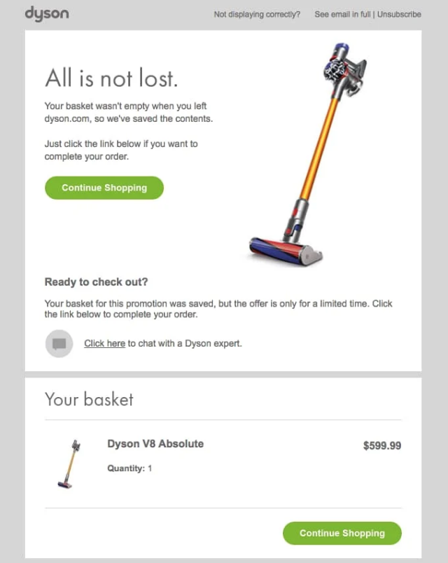 This is the ideal abandoned cart email since it has everything: great language, a clear CTA, personalization by displaying the customer’s cart, and urgency.