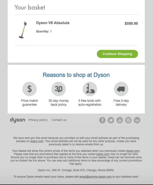 The design is simple and minimalistic. The product details are highlighted in the email itself, making it easy for the customer to decide. The “Continue Shopping” CTA encourages users to add more things to their cart.