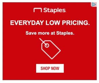 The banner ad has a uniform red background with the Staples logo at the top and everything else in white font, as well. It is an all-text banner ad with just a tag icon, making it truly minimalistic.