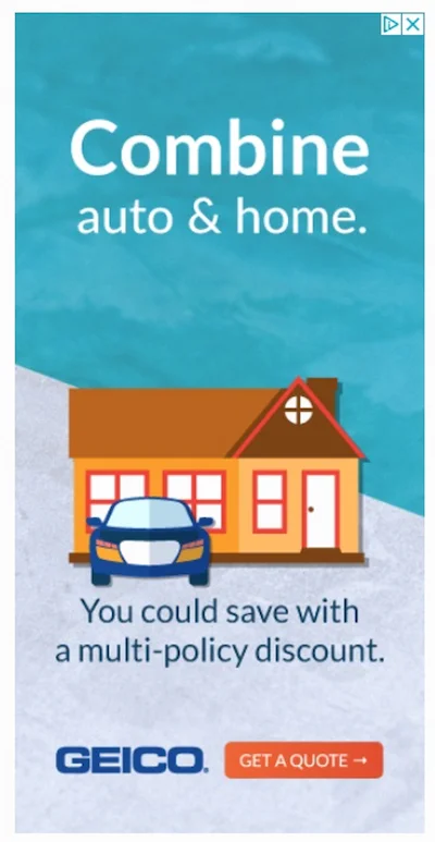 Geico not only makes use of bright colors and a fun image that visually tells a story, but it also changes the traditional size and scale of digital banner ads. This digital banner by Geico, called the skyscraper ad, promotes the company’s new offer on a multi-policy.