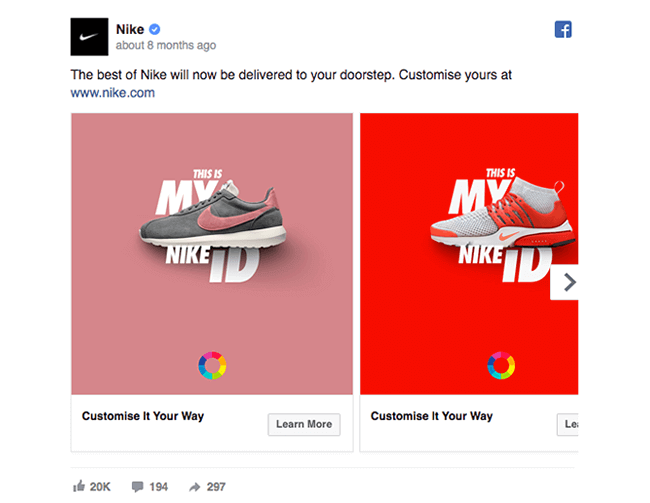 Nike has always been creating strong ads. Focus on the way this one gives ample importance to three crucial elements of any marketing copy: the product, description, and call-to-action phrase. It attracts the potential customer’s attention by displaying the product in multiple colors.