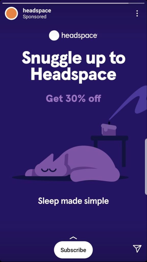 Headspace is an app that specializes in meditation. This entire Instagram ad screams peace, calm, and serenity. The colors and graphics that have been used are light on the eyes. Using words and phrases like “snuggle” and “sleep made simple” is also doing the trick by invoking a longing for coziness among readers.