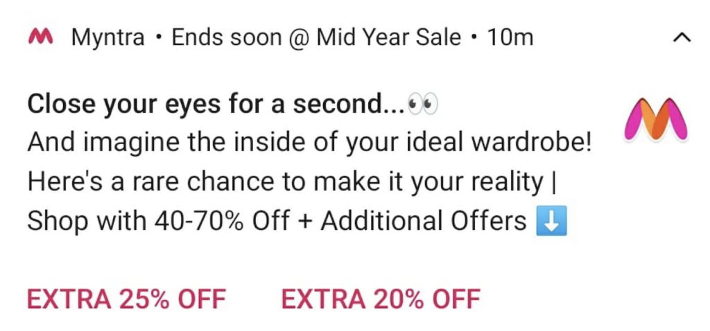 Myntra is an e-commerce app. This app notification has perfectly used value-based call-to-action phrases. Everything from the title of the message to the text underneath is catchy. And the CTA clearly guides the user to take the next step to avail of the irresistible offer described above.