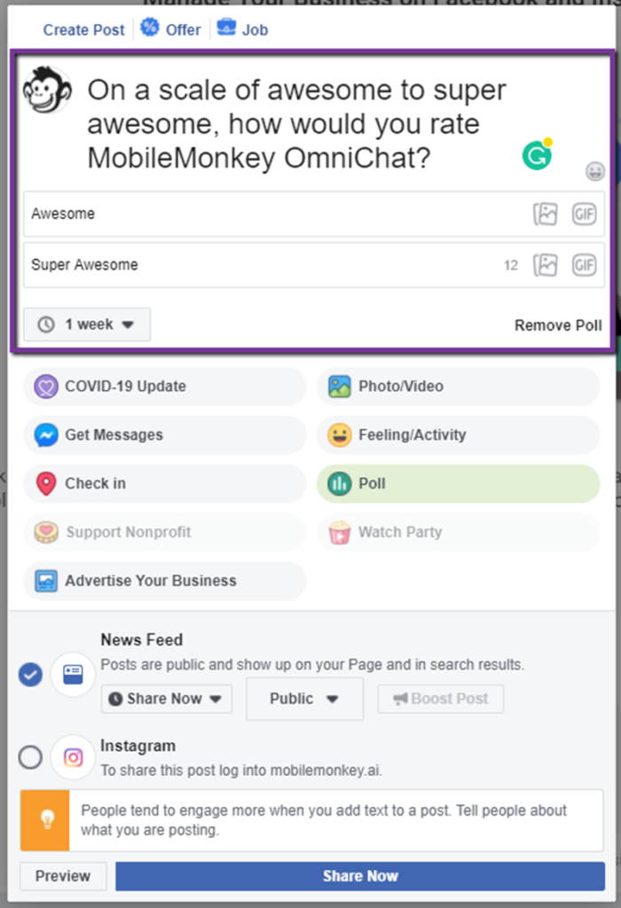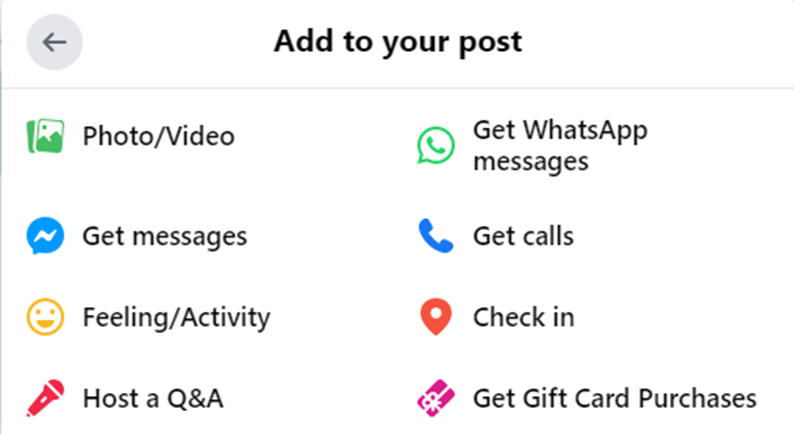 Apart from the ones we’ve listed, you can also do a quick Q&A (question and answer), a check-in post, gift-card options, or advertise jobs by just clicking on the appropriate button.