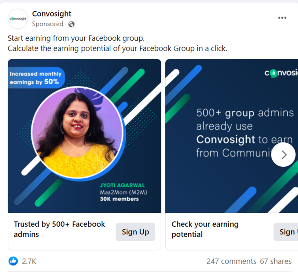 You can create a carousel from the Facebook Business Manager by clicking on ‘create a post’ and then choosing ‘Carousel’ from the options. You can also create a carousel-based ad like the one shown below to drive engagement.