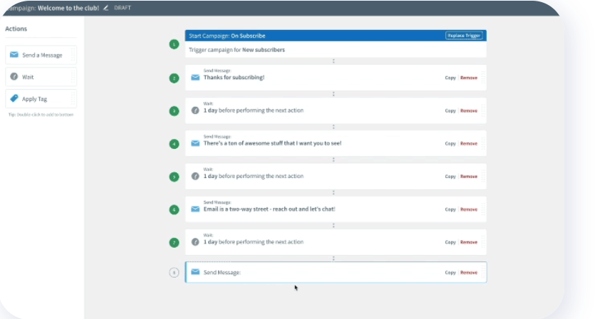 No monkey business here! MailChimp has one of the best email template builders that help you create beautiful emails to hold your audience’s attention. It allows you to build targeted drip campaigns for improved engagement and conversion.