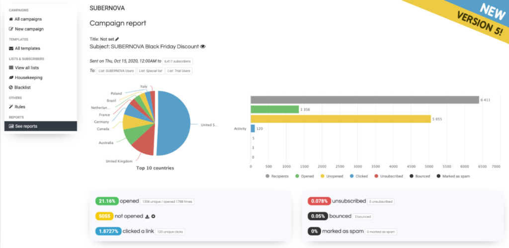 This platform works on Amazon’s Simple Email Services (SES). It is a self-hosted email newsletter application that lets you send trackable emails via SES. The key benefit is cost; you can send bulk emails at an insanely low cost per campaign. It comes with reports and white-labeling options.