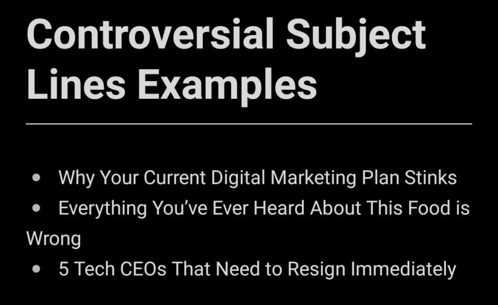 Controversy tends to sell and attract a lot of attention. It’s hard to simply skim through subject lines that may scandalize readers. However, you must be careful when using shock or controversy in your subject lines. By using such subject lines generously, you could gain more open rates, but at the risk of losing clients. This method necessitates trust in your knowledge of your audience’s preferences and requirements. It’s a bit of a tightrope, but the payoff may be great.