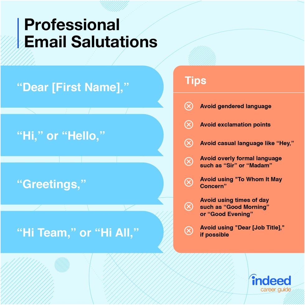 However, if the email is for someone you already know or someone who works in the same organization as you, you can start with a “Hi” or “Hello”, followed by their first name. If you are addressing a group, and are not sure who the recipient may be, you can either start with “Hi/hello all” or “Hi team”, if you know the people you’re addressing. Whatever you do, you must not use genders or a casual “Hi guys/folks” greeting.