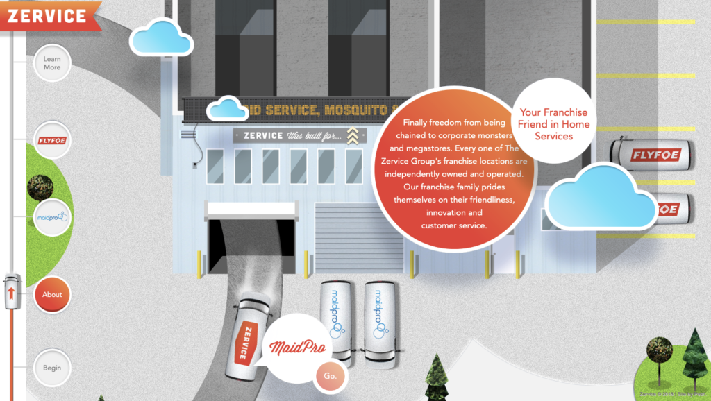 With its interactive website, Zervice, a website that has won numerous awards, engages and captivates its audience. Zeerservice also uses every little space on the screen to educate them about their services. The company provides you with a ride on a road trip while discussing the different franchises they operate as they drive across various landscapes.