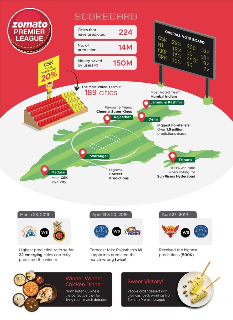 With tens of thousands of dishes to choose from, ordering food online could not have gotten any more exciting. In addition, users got up to a 40% discount when they ordered food from any of the Zomato-listed restaurants. The best part is yet to come: in case their prediction was correct, users not only won the prize but also got an additional 30% cashback. Great food and cricket, especially IPL, go well with Indians. Zomato has added a dash of excitement to the IPL season with its ZPL campaign.