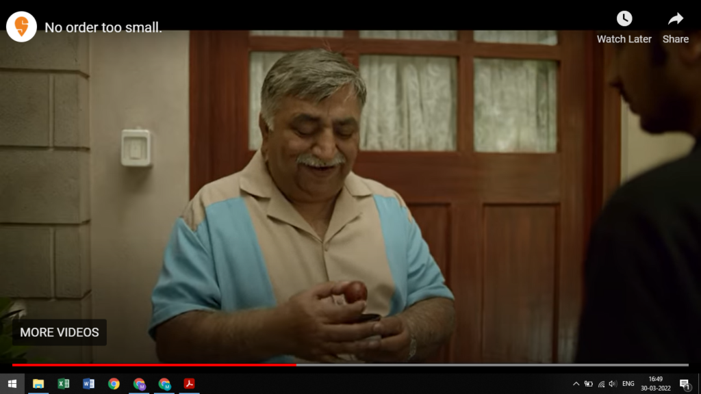 The IPL ad campaign is a 20-second spot featuring a man in his forties, ordering a single piece of gulab jamun on Swiggy. He pops it in his mouth before his wife can realize what’s happening. With no dialogue between the characters, the sheer expressions on the couple’s faces, and the running IPL commentary on TV in the background, said it all. The ad conveys the message that it is people and not their order value that matters more to Swiggy.