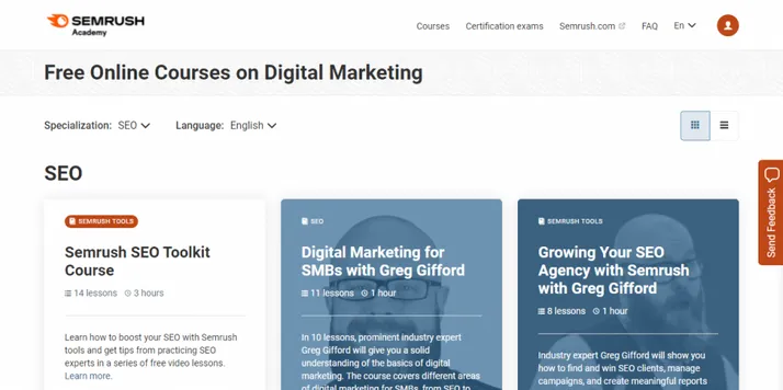 SEMrush has multi-lesson courses with progress tracking mechanisms and is free. You can take up these courses for free after signing up. There is no obligation on you to buy anything from SEMrush either.