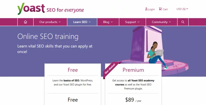 Yoast’s online courses teach you several aspects: SEO for WordPress, SEO copywriting training, etc. You can access all the courses and other premium features if you upgrade to a $99 per annum Yoast premium subscription. It’s suitable for beginner to advanced level students who want to improve their SEO skills, especially for blogging or WordPress.