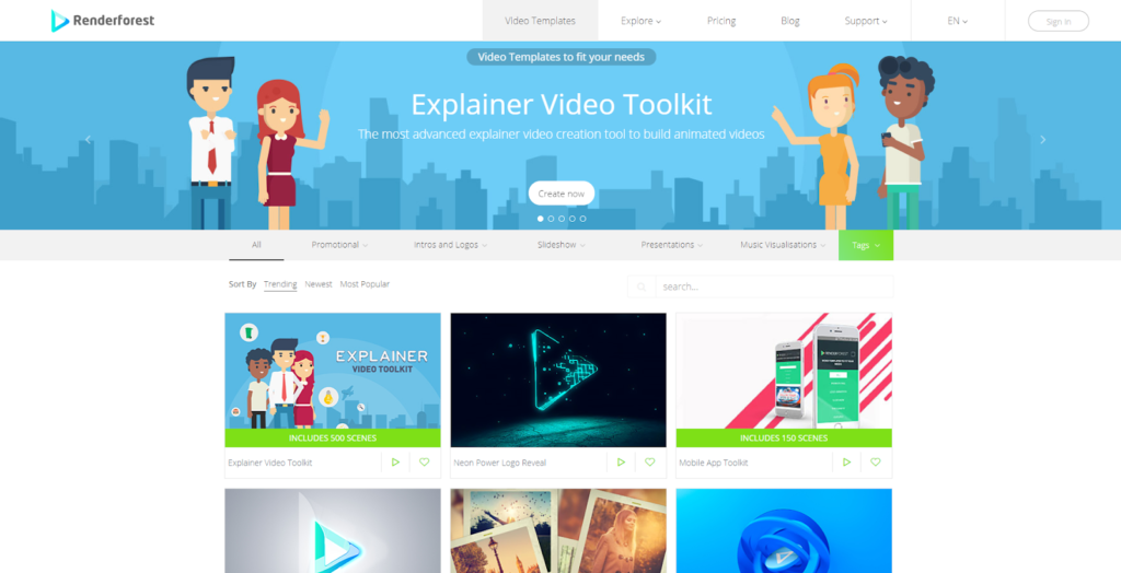 A social media video tool with an ease of use comparable to anything else out there, Renderforest allows you to publish videos directly to social media channels such as Facebook, Pinterest, Instagram, Google+, and Twitter. The free plan has a watermark on the content made by it which can be overcome by going premium