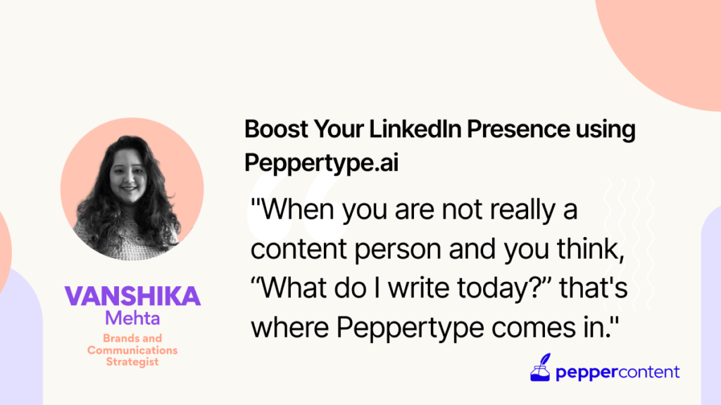 In this discussion on PepperType.ai, Vanshika Mehta, a brand strategist, and a communication consultant shared her LinkedIn building methods with the host, Pranav Goyal, from PepperType’s product and growth department, to help startups and individuals perform better in the digital market.