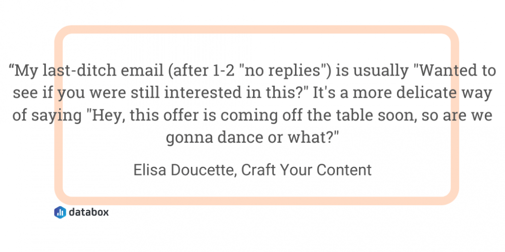 - Remind them that this is the last email they will receive from your end, as this will give them a sense of urgency or scarcity. Also, by doing so, you will sound genuine and polite.