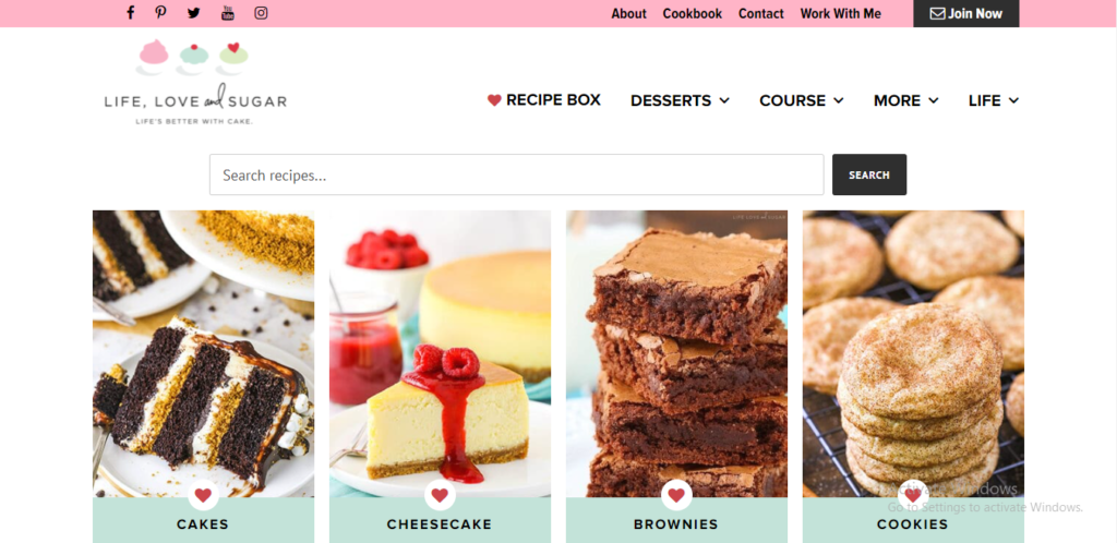 This business blog primarily focuses on baking cakes. The website has delectable visuals of food, as any good food blog should have. The monotony is broken by sections about savory dishes, helpful how-tos, and insights into the business owner’s life.